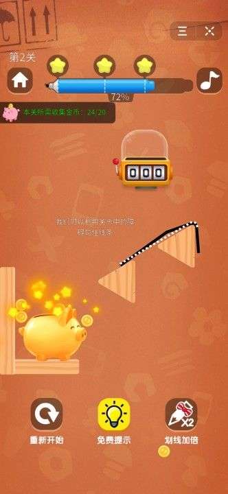 1、带着小猪存钱罐去完成关卡的挑战,在一定的时间内,小猪还会从粉色皮肤变成金色的,这个时候的奖励可是翻倍的。