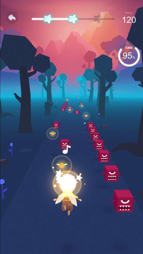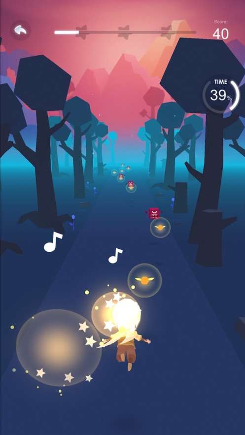 音乐降临在这里有一个追随音乐的小男孩角色,那很喜欢音乐这里就像大家提供了不同的挑战关卡,需要大家带领着它开始音乐的挑战。在这里角色一只张开上手向前奔跑,大家只要控制方向让它收集音乐符号还有金币就可以了。及时的躲开红色的方块怪兽,游戏会在侧边显示当前音乐完成的半分比是多少。玩家可以看着这个数值来弯沉给自己的音乐挑战。