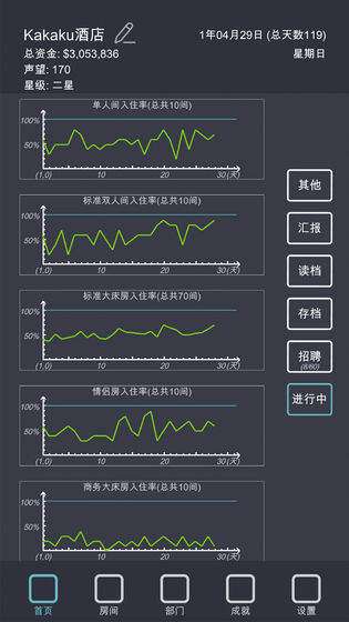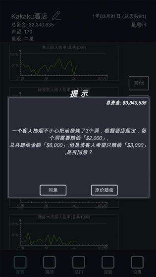 游戏中玩家需要扮演一名老板的角色,为了酒店的壮大与发展,您需要决策酒店的发展制度,什么时候做什么事,还需要安抚员工的不满情绪,等等之类的,最终你能否发展为世界第一大酒店呢