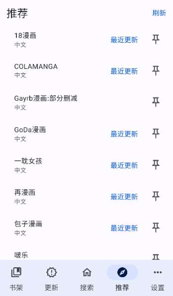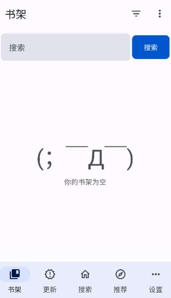 5、正版界面有五个栏目,分别是书架、更新、搜索、推荐、设置,请注意认准。