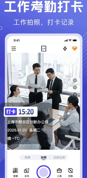 4、帮助用户轻松实现工作出勤登记,以便通过软件轻松拍摄出勤登记照片。