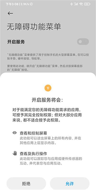 3、点击允许开启无障碍功能菜单。