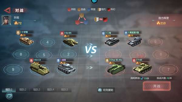 3、玩家可以收集超过100辆坦克和装甲车,通过技能配置和阵容阵型参与5V5实时战斗,拥有放置战斗、战术策略等核心玩法。
