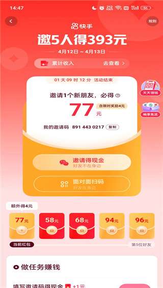 3、还可以邀请身边的好友来看短视频赚钱,完成日常的邀请任务就可以赚393元。