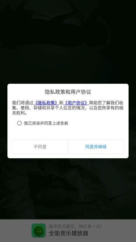 1、下载并安装全能音乐播放器app,阅读协议并选择是否同意。