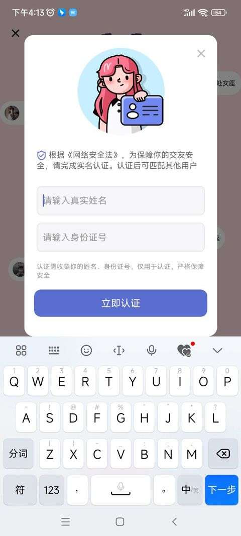3、由于需要实名认证才可开启聊天,输入姓名和身份证号认证。