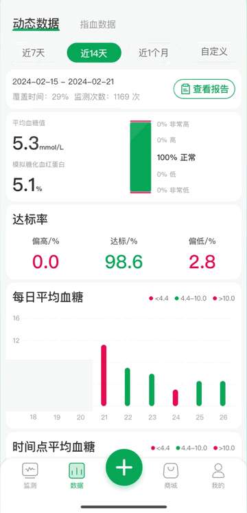 3、清晰的数据可视化:动态生成14天血糖趋势图,直观显示血糖控制目标达成率。