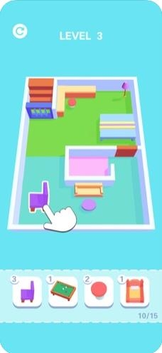 Place Master在这里玩家们就是一个职业的装修设计师,每一种房型的装修还有改造你都能够很好的完成。游戏中就为大家准备了不同的关卡挑战,会提供一些家装产品放置在下面的选择板块。物品上面都会有一个白色的数字圈圈标明这件物品当前有多少个,根据提供的房型来选择就可以了。
