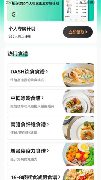 4、查看饮食规划在“饮食”模块中输入个人健康数据,系统将根据您的需求推荐合适的饮食方案。