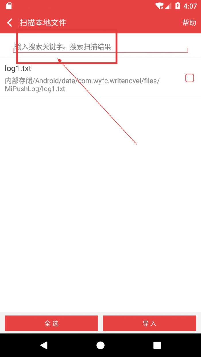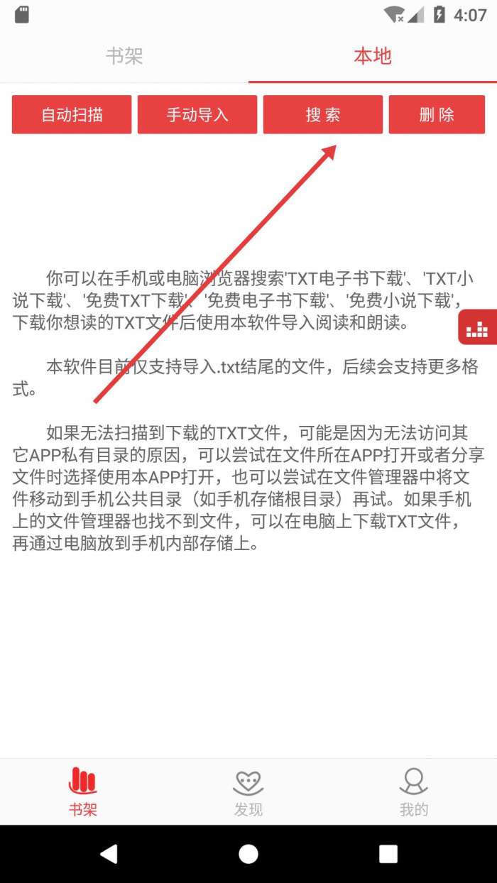 3、设有自动扫描、手动导入等功能,点击搜索可查找本地TXT小说文件,还提供导入格式及问题解决指引。