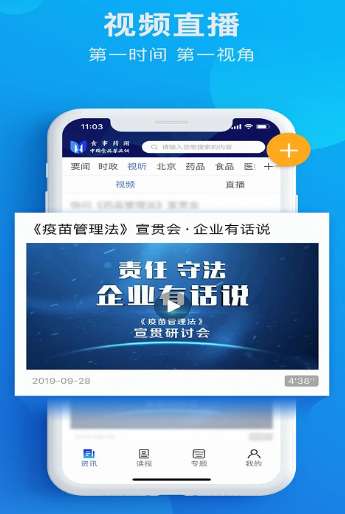 2、视频直播 食品、药品、健康领域的高清原创短视频,马上播放,先看。 在互动直播中,可以立即直击新闻事件,一边看现场一边参与直播交流,第一时间、第一视角看到吃药。