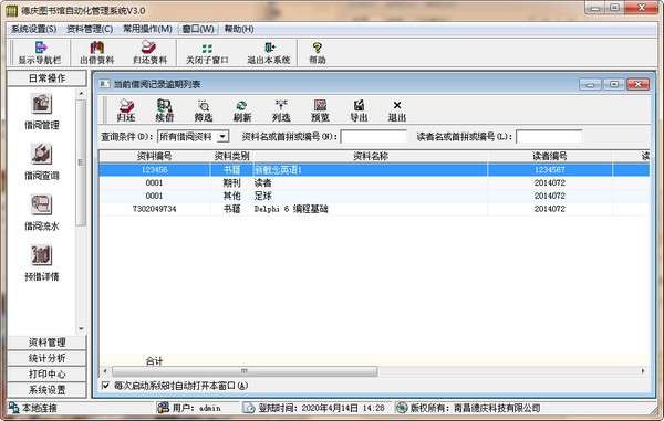 德庆图书管理系统最新版是一款功能非常强大的图书管理软件,本系统在继承了以往系统版本优点的基础上做了进一步优化;德庆图书管理系统 V3.0基本模块为:借阅管理、借阅查询、借阅流水、预借详情、账务管理、备忘管理、书籍管理、期刊管理、物品管理、读者管理、类别资料、资料下架管理等功能。