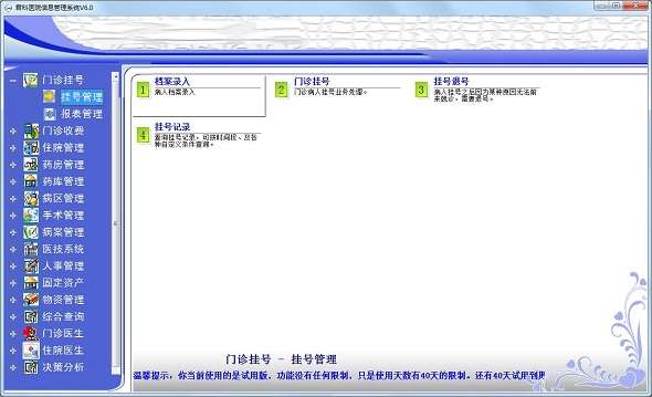1、门诊挂号、挂号收费、挂号条打印,可以按照天、月、年统计挂号收费信息和患者就诊信息