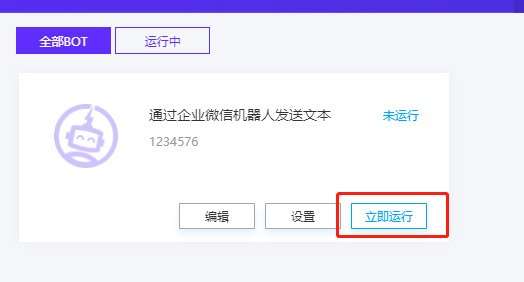 (5)点击【保存】,回到【我的BOT】页面,点击【立即运行】即可开始进入运行状态