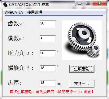 CATIA斜(直)齿轮生成器从名字就可以知道这款软件可以帮助用户设计齿轮,如果你需要快速设计齿轮模型就可以通过这款软件生成,本软件操作简单,打开以后输入齿数、模数、压力角、螺旋角、齿厚五种参数就可以生成新的齿轮,这款软件最大的优势就是可以直接连接到你电脑上安装的CATIA软件,从而在CATIA软件上显示齿轮模型,这样用户就可以开始设计零件了,软件自动检测电脑上已经安装的CATIA软件,从而将生成的模型显示在设计界面!