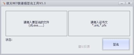秋天NET快速强签名工具使用简单,支持对dll以及EXE添加签名,如果你的程序没有签名就可以通过这款软件执行,直接将你的EXE或者是dll添加到软件,随后添加证书到软件就可以立即签名,几秒钟就可以完成签名操作,适合net类型的软件添加签名,如果你的软件基于net环境开发,可通过这款软件加载snk、pfx证书执行签名,三个步骤就可以完成签名。