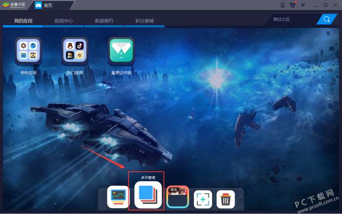 1、打开我们已经安装好的蓝叠模拟器,启动后可看到主界面下方有几个按钮。在这里点击选择下图所指的多开按钮。