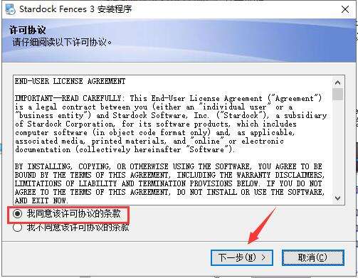 1、在PC下载网下载fences软件包,解压缩后双击“Fences_v_3.0.9.11.exe”程序进入安装向导界面,查看软件许可协议,选择【我同意改许可协议的条款】,点击【下一步】