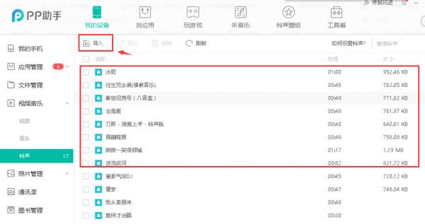 5、用户找到在PP助手下载的铃声后,选择需要的铃声,然后点击左上角的导入选项,就可以将这些铃声导入到苹果设备中,用户只需铃声导入完成就可以了。如下图所示,导入速度是很快的,所以不用太着急。