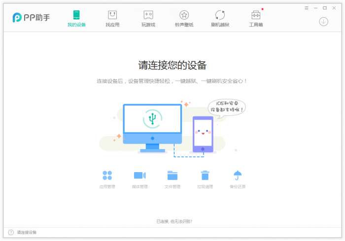 1、运行pp助手软件进入主界面,可以看到主界面有我的设备、找应用、玩游戏、听音乐、铃声壁纸、工具选选项,我们需要先使用USB连接苹果设备。
