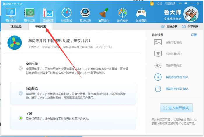 4、温度管理中还包含“节能降温”功能,可以节省电脑的功耗。