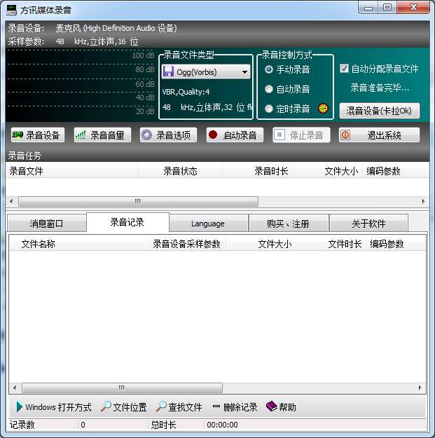 11、消息窗口: 显示录音设备的工作状态,以及录音启动、停止的相关消息。
