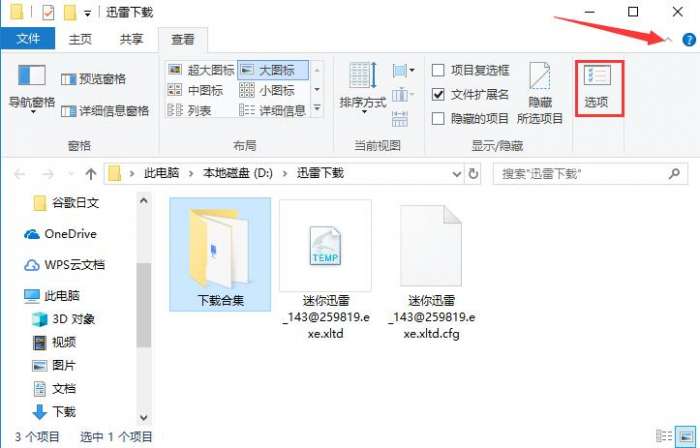 2、打开迅雷下载目录,点击文件夹上方工具栏右侧的“﹀”打开功能扩展菜单,然后点击其中的“选项”。