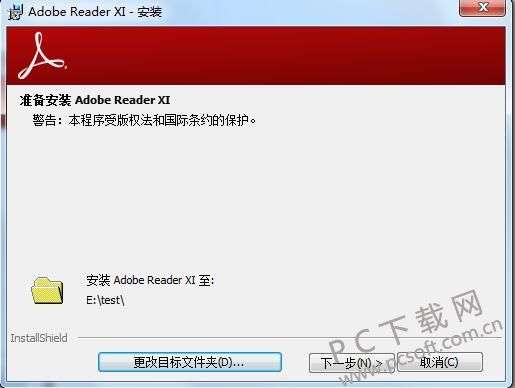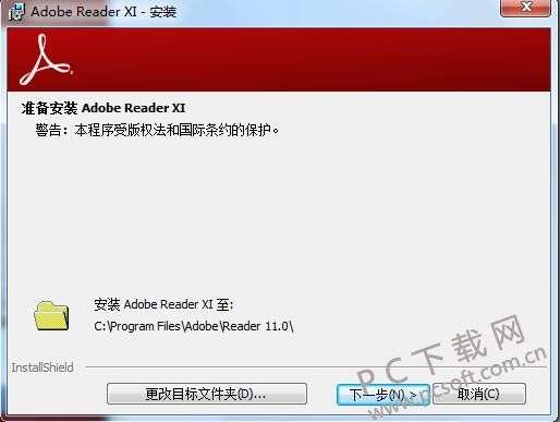 2、点击“更改目标文件夹”选项,在打开的窗口中,您可以自行选择Adobe Reader XI(PDF阅读器)安装位置。设置完成后点击下一步即可。