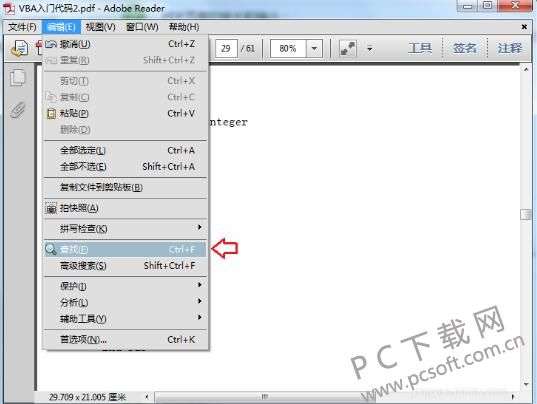 3、如果您要查找内容,您可以点击Adobe Reader XI(PDF阅读器)菜单栏中的编辑,在弹出的选项中点击【查找】,或者您可以使用ctrl+f或编辑菜单中的查找功能快速查找你想要的内容。