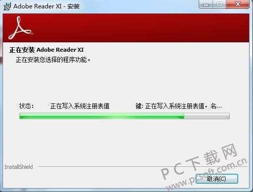 4、Adobe Reader XI(PDF阅读器)正在安装中,我们需要耐心等待安装进度条完成,软件安装速度是很快的,只需要等待一小会就可以完成了。