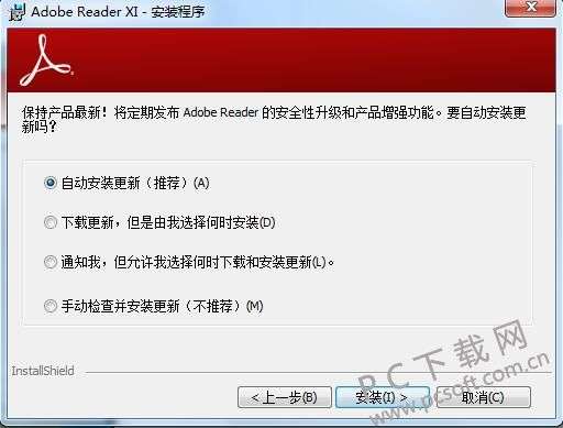 3、进入到Adobe Reader XI(PDF阅读器)更新界面,如下图所示,选择更新方式,在这里大家根据自己的使用需求任选一项即可。这里小编就选择最后一项手动更新选项了,之后再点击界面下方的安装按钮。