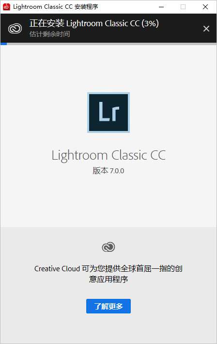 4、这时Adobe Lightroom Classic CC 2018开始安装了,我们让软件自行安装,耐心等待片刻后,Adobe Lightroom Classic CC 2018就安装完成啦。