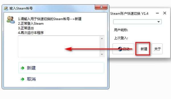 一、下载打开软件,点击新建,输入你的STEAM账号,点击确定