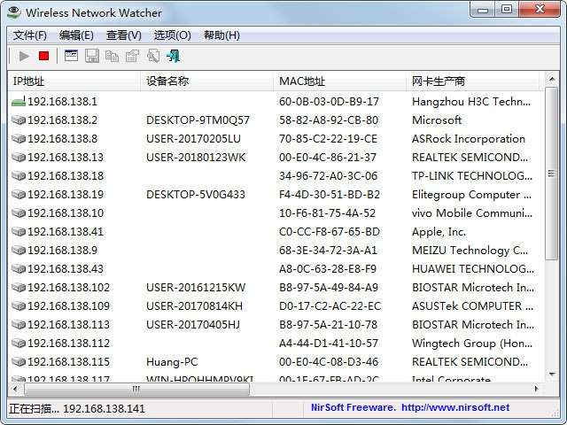 本软件的主要用途就是用来查看无线网络里的用户的详细信息(包括IP地址,设备,MAC地址,网络置配器等)