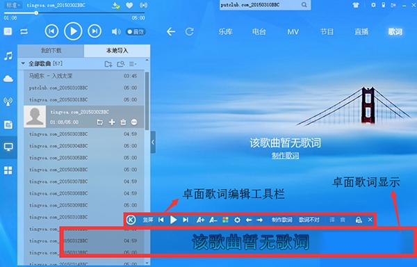 2、点击,并用鼠标点击桌面显示的歌词栏,桌面显示歌词的编辑工具栏会被看到