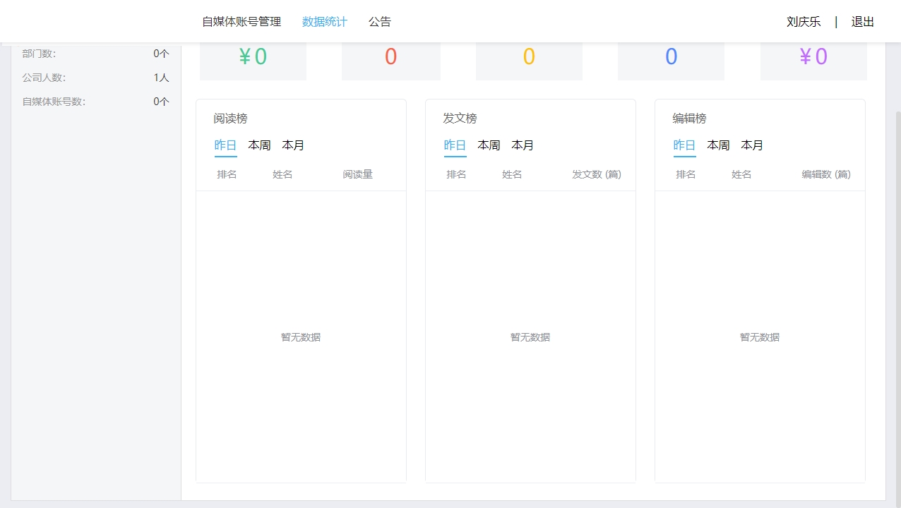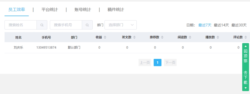16、工作台的界面就是这样的,可以显示员工效率、平台统计、账号统计、稿件统计
