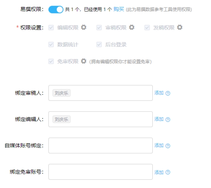 12、也支持权限设置功能,可以设置易撰权限:共 1 个,已经使用 1 个 购买 (此为易撰数据参考工具使用权限)