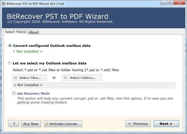 如果有人想将损坏或损坏的 PST 文件转换为 Adob??e PDF,那么他可以选中“使用恢复模式”选项。此选项将帮助您转换通常损坏的 .pst 或 .ost 文件。如果您在转换后的 PDF 中丢失了一些文件夹,我们建议使用此功能。但是,BitRecover 建议使用PST 修复工具来修复高度损坏的 PST 文件。