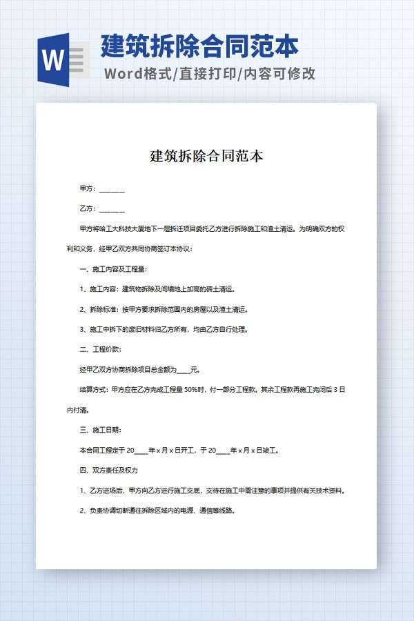 建筑拆除合同范本是用来规范拆除建筑的流程所提供的范本模板。建筑拆除合同范本由PC6为您提供免费下载,源文件为Word格式模板,大家可以直接下载源文件,以便于修改内容。