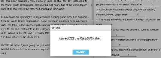 监测考生进入试卷之后,作答过程中未一直处于试卷页面中的用户操作行为。系统实时监控考生试卷页面切出操作,一旦发现系统将即刻警告考生,并发送异常行为报告至监考教师。