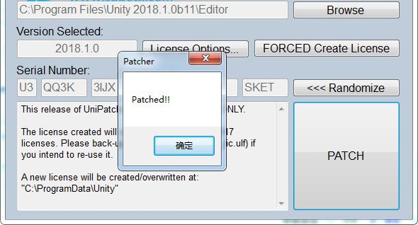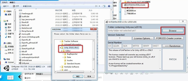 6、安装完成后,运行“Unity 2018破解补丁UniPatcher2018_v1.exe ”,首先点击“Browse载入安装目录,如默认文件夹为C:Program FilesUnity 2018.1.0bf2Editor
