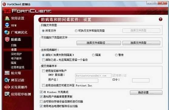 9、由病毒样本实测可知,“飞塔”默认设置下对检测到的病毒程序自动执行清除操作(如果清除失败,自动隔离病毒文件)。当然,该软件支持用户自定义其它处理方式。另外,该软件的扫描过程中默认将扫描所有类型的文件,用户也可以自定义扫描文件类型。该软件还支持用户自定义扫描过程中需要排除的文件或者路径;