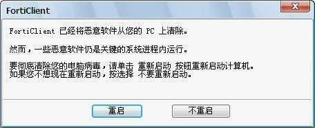 7、对于执行某些扫描任务中可能会遇到一些比较顽固的或者危险的恶意程序,“飞塔”在对这些病毒文件自动执行清理操作时会提示用户重启计算机以保证将其彻底清除;