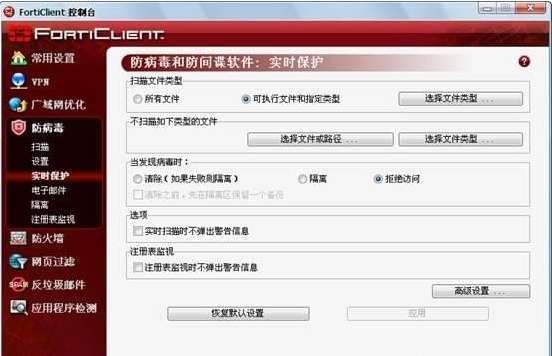 10、“飞塔”提供了实时保护服务,支持用户自定义需要实时保护的文件类型以及不需要保护的文件或路径,另外,该软件默认对实时拦截到病毒采取“拒绝访问”的处理方式,支持用户自定义其它处理方式;