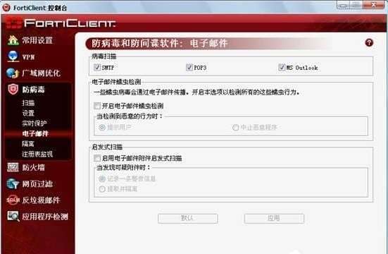 12、“飞塔”提供了电子邮件防护,能够提供对SMTP邮箱、POP3邮箱和Outlook邮箱的安全防护,同时,该软件提供了电子邮件的蠕虫检测服务,有需要的用户可以自行手动开启该服务。另外,该软件支持启用对电子邮件的启发式扫描;