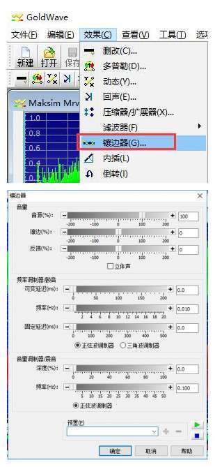 点击GoldWave顶部菜单栏中的“效果”按钮,在打开的下拉菜单中单击选择“镶边器”功能,之后在打开的新窗口中就能看到相关的镶边设置了,根据需要进行修改即可。