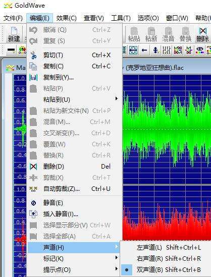 有时在编辑中只想对其中一个声道进行处理,另一个声道要保持原样不变化,这该如何进行选择呢?使用编辑菜单的声道命令,直接选择将要进行作用的声道就行了(上方表示左声道,下方表示右声道)。