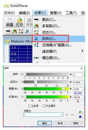 回声效果是GoldWave的一大特色,并且制作起来非常方便。我们首先点击顶部菜单栏中的“效果”按钮,然后在打开的下拉菜单中点击选择“回声”选项,之后就可以在打开的新窗口中设置回声效果,并且可以直接试听了。