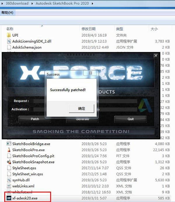 7、打开软件包,将注册机xf-adesk20.exe复制到软件安装目录,右键桌面快捷方式选择打开文件位置进入安装目录,运行注册机,点击patch打补丁,成功打补丁,如图所示。