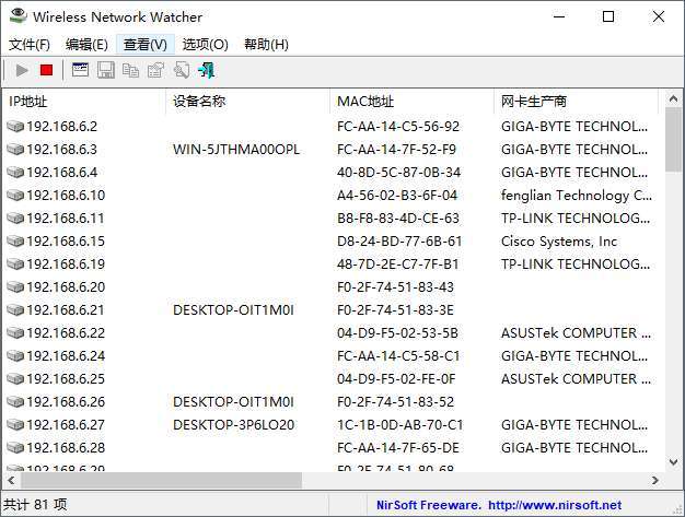 运行 Wireless Network Watcher 之后,点击「开始扫描」按钮,软件便会自动扫描整个局域网网段的IP (默认从192.168.1.1到192.168.1.255,你也可以自己指定范围),然后软件就会把全部连接上的网络设备(包括手机、电脑、平板、游戏机等等)的IP地址、MAC物理地址、制造厂商等信息列出来。一旦发现有陌生设备,可以立即通过路由器设置,将该设备的MAC物理地址加入黑名单,或者更换WIFI密码来阻止他人继续蹭网。